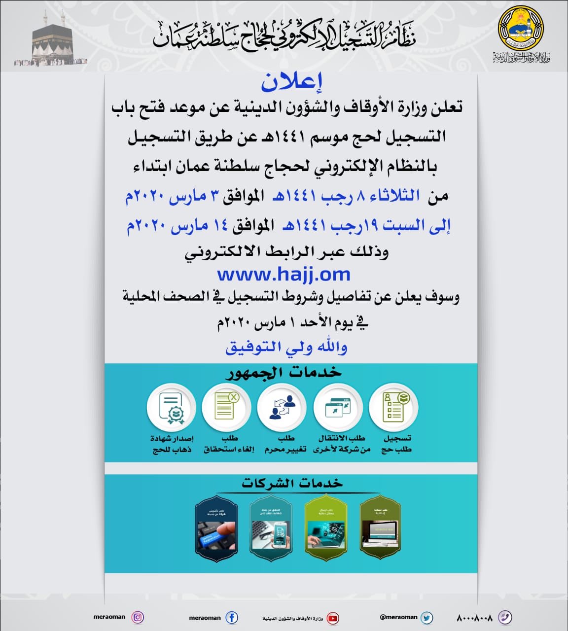وزارة الأوقاف والشؤون الدينية سلطنة عمان On Twitter إعلان موعد فتح باب التسجيل لحج موسم 1441 هـ عن طريق النظام الإلكتروني عمان الحج